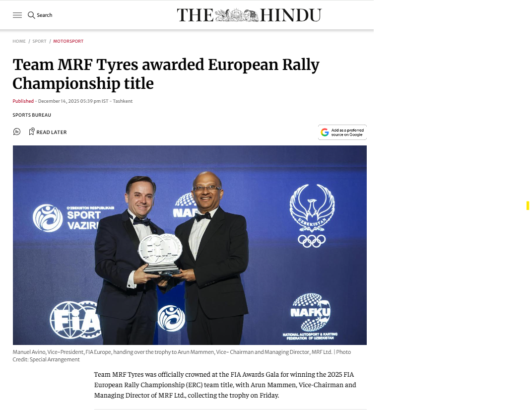 Tashkent (UZB), December 12th, 2025 — The night of Friday, December 12th, marked a high-point for MRF Tyres as its Vice-Chairman and Managing Director, Mr. Arun Mammen, stepped on stage at the FIA Awards Gala in Tashkent to collect the official Team Trophy after securing the 2025 FIA European Rally Championship (ERC) Team Title.