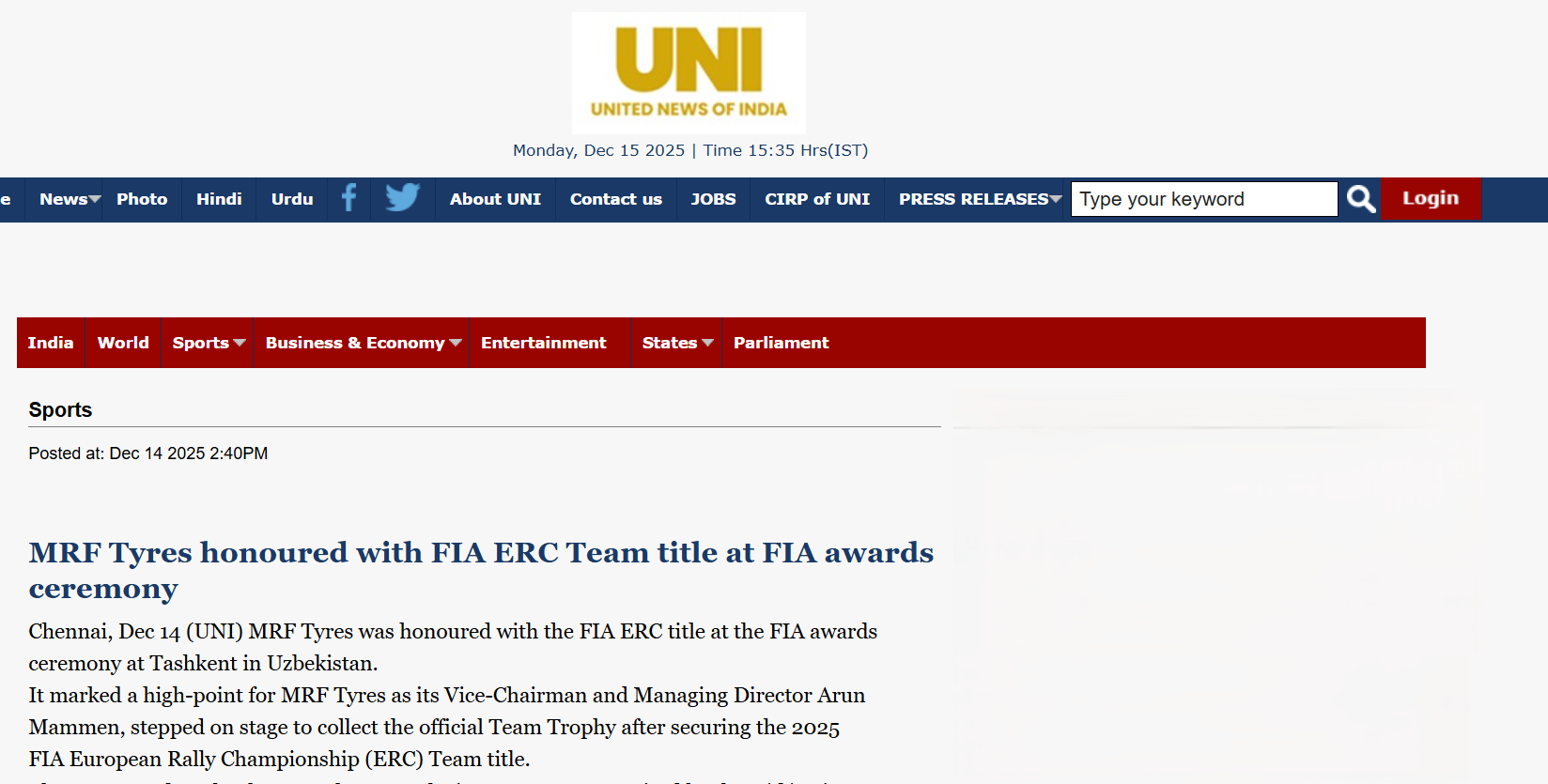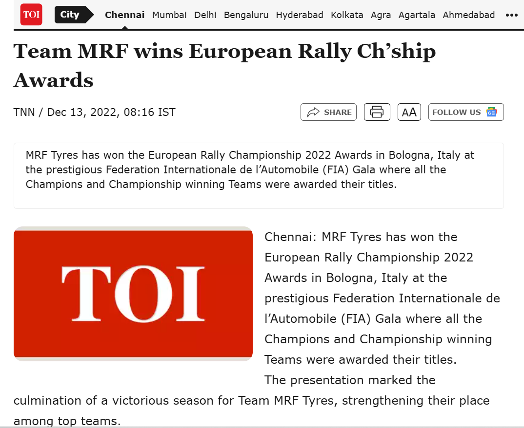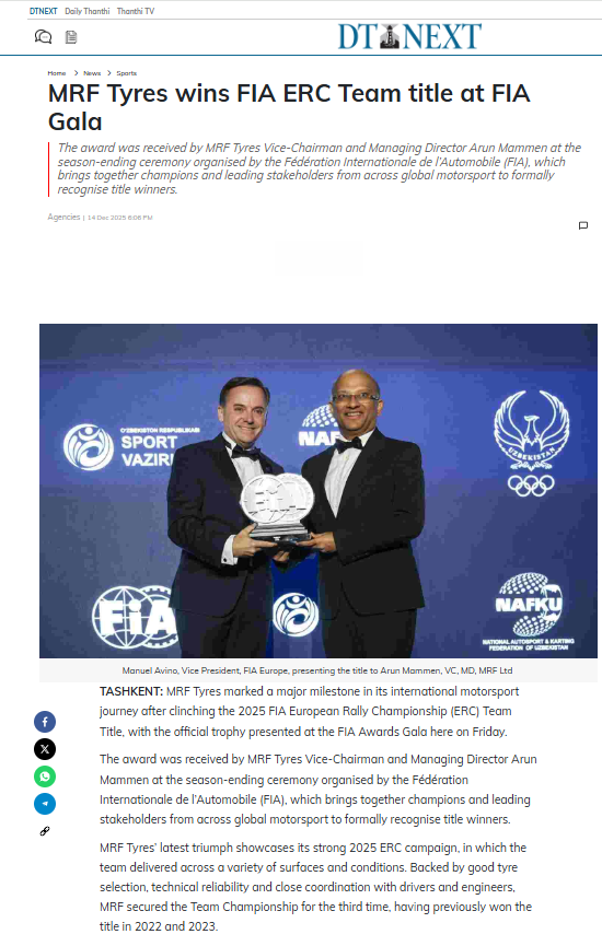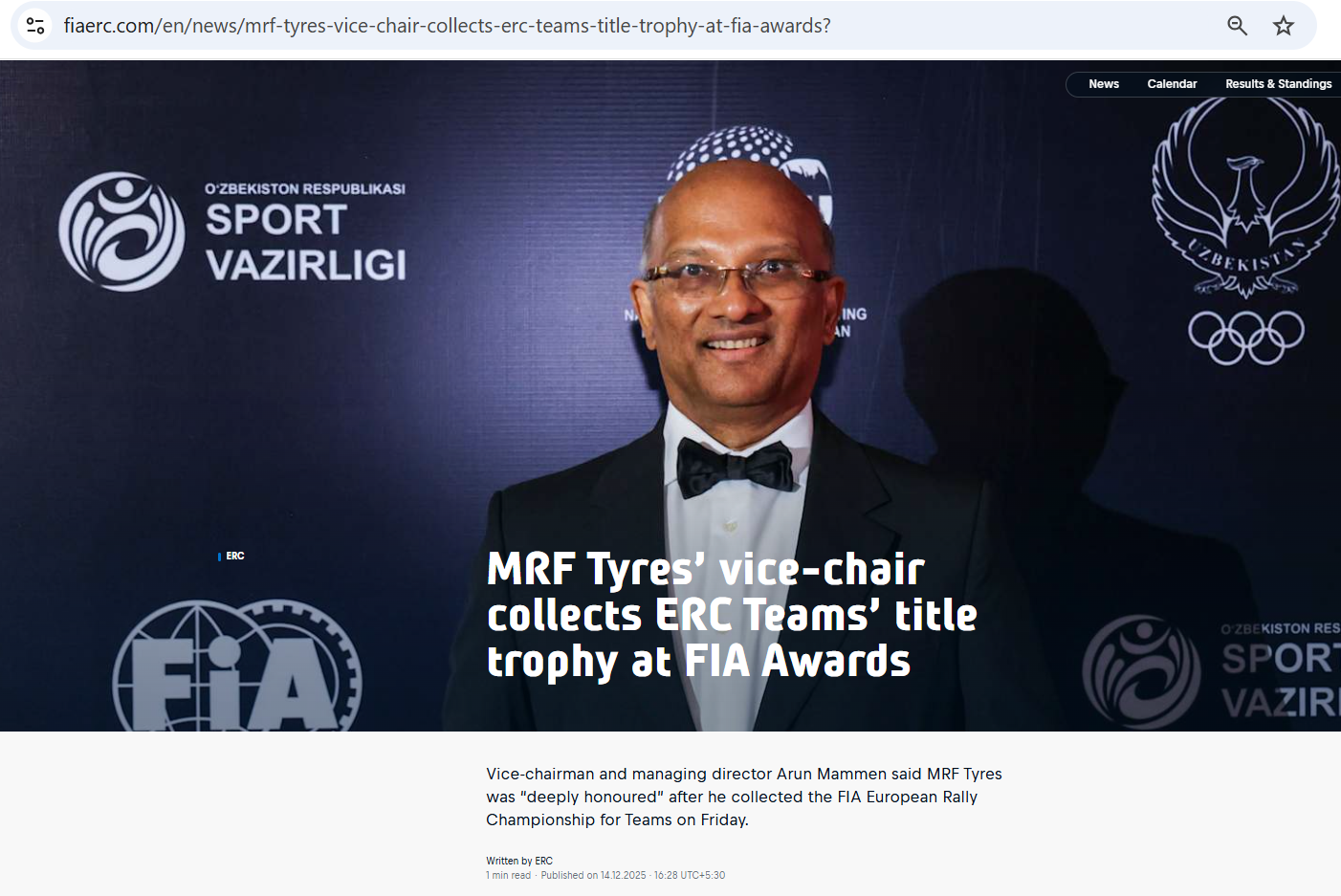 MRF Tyres extends warm congratulations to all drivers, co-drivers and team personnel who contributed to this achievement. The recognition at the FIA Awards Gala reinforces MRF Tyres’ commitment to excellence and confirms its position as a leading force in international motorsports.