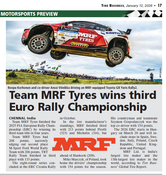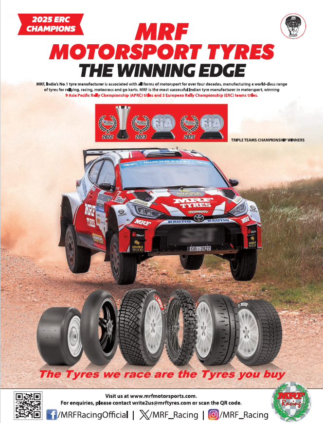The 2025 ERC campaign saw Team MRF Tyres deliver consistently outstanding performances across diverse terrain, rally by rally. Thanks to strong results, strategic tyre choices and seamless coordination with crews and engineers, MRF Tyres secured the ERC Team Championship for the third time, following the titles achieved in 2022 and 2023. The result stands as a testament to tyre performance, reliability and to the overall strength of the programme.
