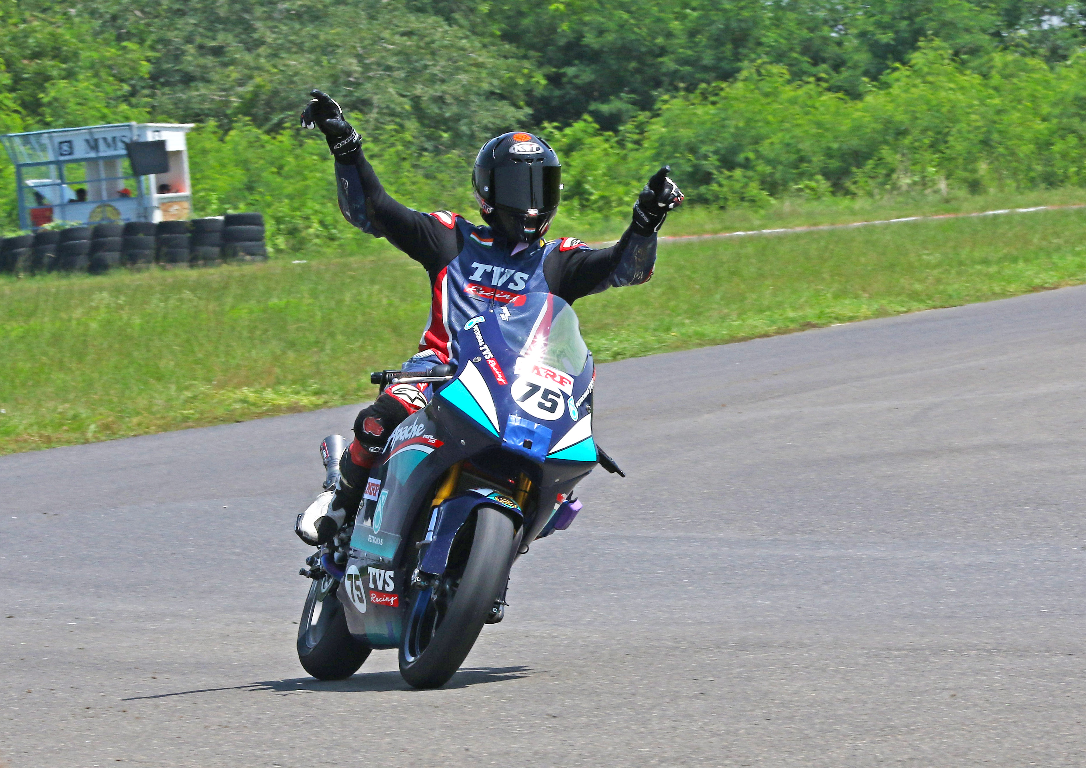 In today’s race, Sarthak displayed impressive pace which helped him to make positions after dropping to fourth despite a good start that had put him in the lead. “Somehow, I lost position after a good start and early lead. I dropped to fourth and behind the three RACR riders, including Rahil, Rajini and Anish (Shetty). I managed to move past two them and then made a good move on Rahil at Turn 4 on the last lap and rode a bit defensively before pushing a bit more. In yesterday’s race, I was having lot of wheelspin on the rear tyre which I had used for qualifying. Today, we fitted new tyres which made a lot of difference,” said Sarthak who last weekend scored his sixth consecutive podium in the Asia Road Racing Championship in Indonesia and is placed second in the TVS Asia championship.